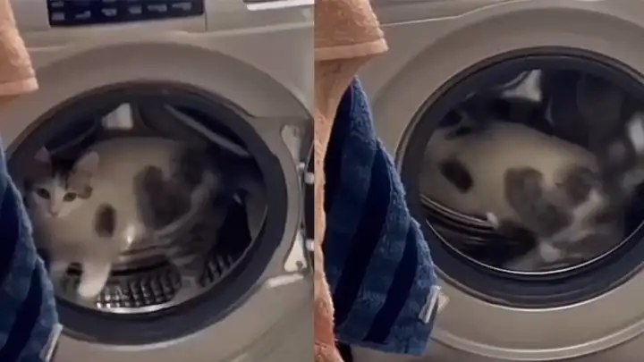 Котик показал хозяину, как правильно пользоваться стиральной машиной