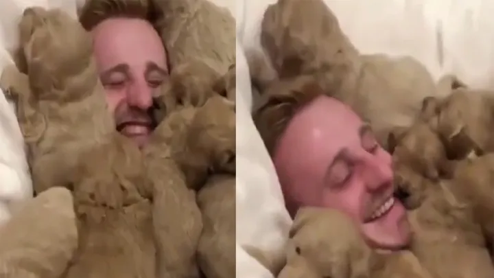 Атака милотой: парень утонул в объятиях щеночков, но был очень этому рад