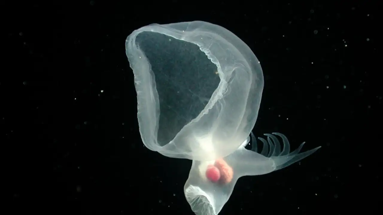 Более 20 лет ученые из Института исследований аквариума Монтерей-Бэй в Калифорнии (MBARI) время от времени сталкивались с этим пятидюймовым полупрозрачным существом, обладающим странным сочетанием черт. Его лицо окружено огромным капюшоном, который он использует, чтобы обхватывать добычу и двигаться с помощью струйного движения, как медуза. Его хвост украшен щупальцами, и при угрозе он может оторвать одно из них. При прикосновении его капюшон и хвост светятся созвездиями сине-зеленых точек, словно подводный планетарий.