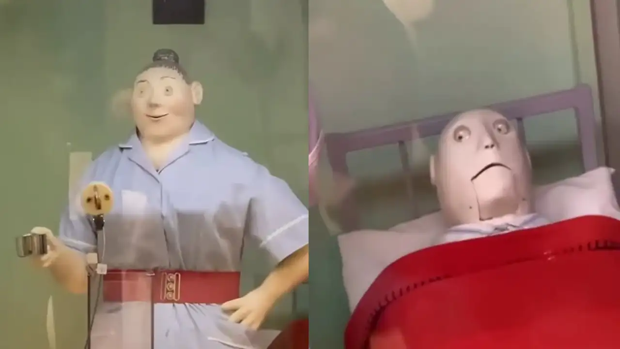 Медсестра-кукла высыпает монетки-пилюли в рот больному. Выглядит так, будто сценарист «Черного зеркала» раньше подрабатывал еще и дизайнером. Если увидите такое в больнице — бегите.