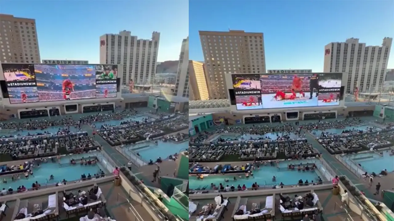 В Лас-Вегасе открылся новый стадион, который больше похож на глянцевую мечту о лете, чем на место для спортсменов и болельщиков. Ведь вместо пластиковых кресел здесь диваны, на которых можно растянуться всей компанией, и бассейны, в которых не возбраняется плескаться, пока на экранах проносятся чужие голы и чужие миллионы.