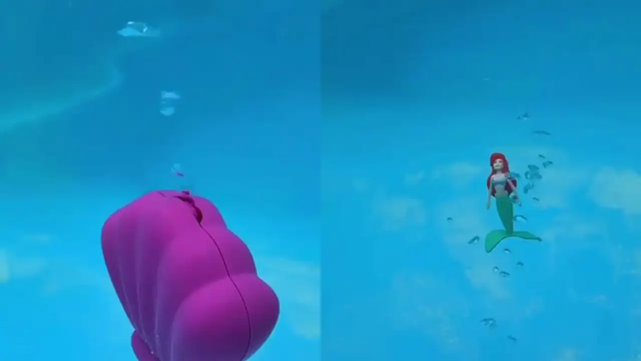 В этом видео подводная игрушка по «Русалочке» завоевывает сердца пользователей Сети. Пластмассовая ракушка бросается в бассейн, достигает дна и раскрывается, выпуская на поверхность игрушечную русалочку.