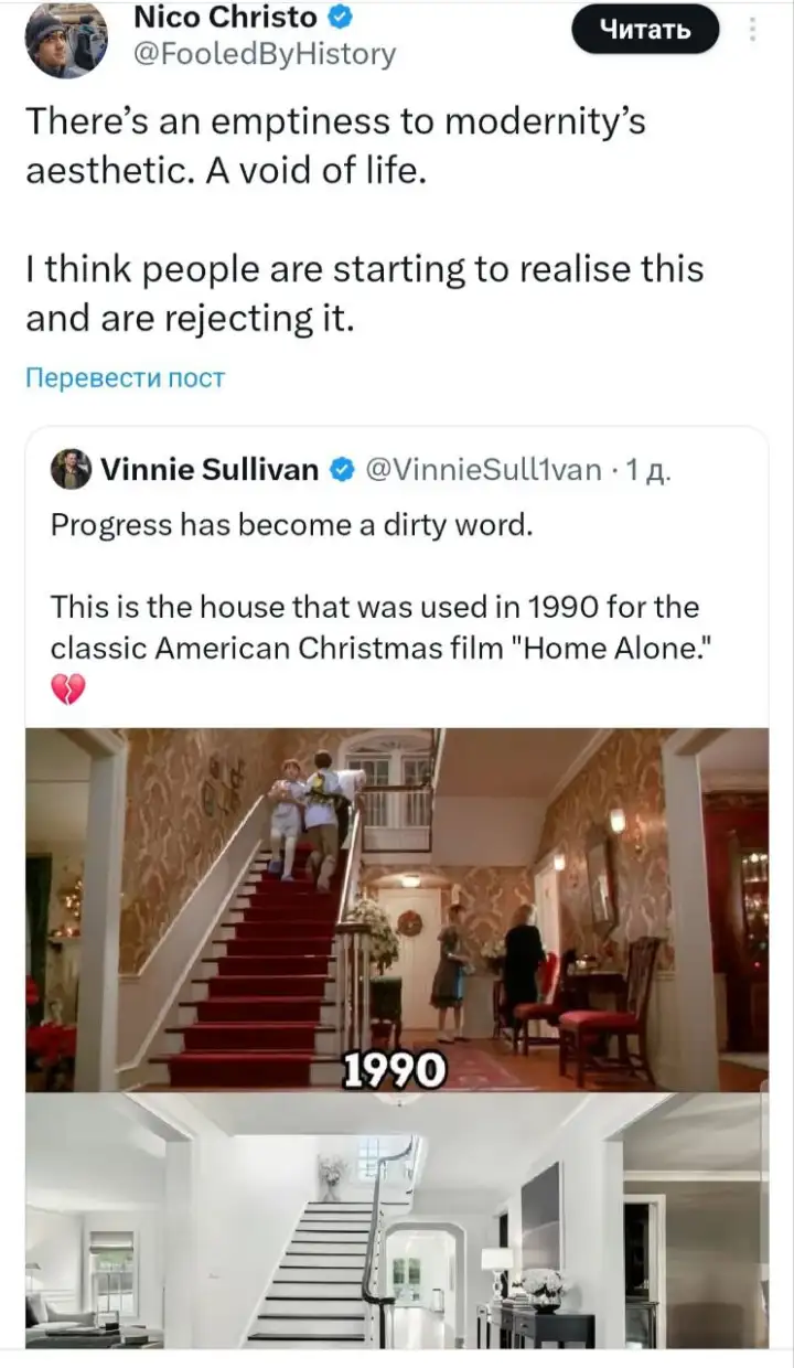 В микроблоге X (ранее Twitter) уже несколько суток не утихают дискуссии вокруг обновленного фасада знаменитого дома из киноленты «Один дома». Часть пользователей считает классический дизайн 1990 года воплощением уюта и тепла, в то время как их оппоненты отдают предпочтение современному и лаконичному варианту 2024 года. А как думаете вы?
