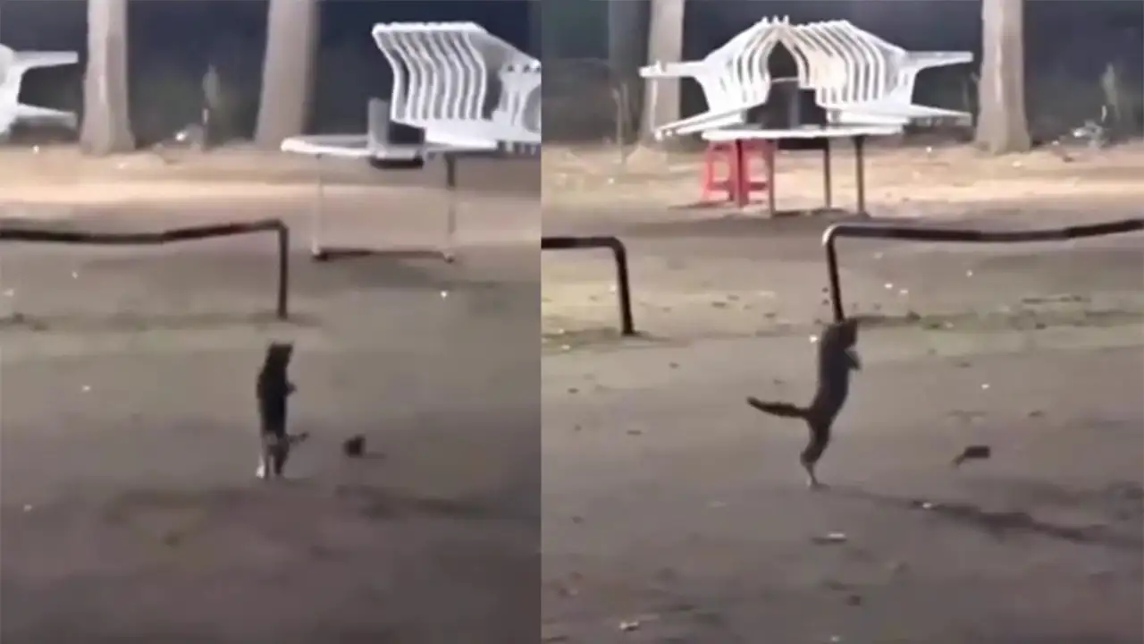 Пушистик из этого ролика, увидев, как лягушка лихо скачет по траве, тут же решил: «Пф, я и получше могу!» И вот через секунду он уже встает на задние лапки и начинает преследовать новую знакомую, с азартом копируя ее прыжки. Хотя котейка очень старался, каждый его скачок выглядел как смесь грации балерины и неловкости пьяного кенгуру.