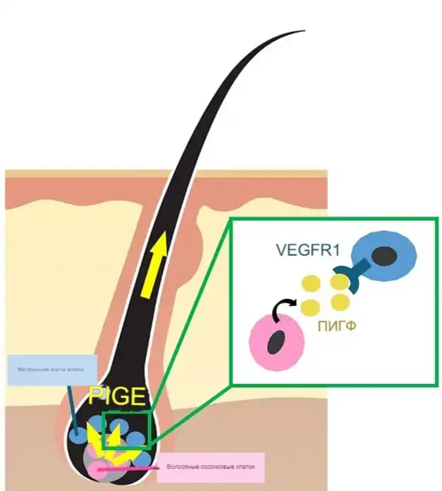 Интересно то, что оба экстракта вместе стимулируют рост волос, причём не только на голове, за счёт воздействия на плацентарный фактор роста (PLGF). Это белок, вырабатываемый клетками дермального сосочка, который играет важную роль в формировании волос, воздействуя на нижнюю часть волосяного фолликула. По сравнению с другими факторами роста, данный белок связан с волосами намного больше.