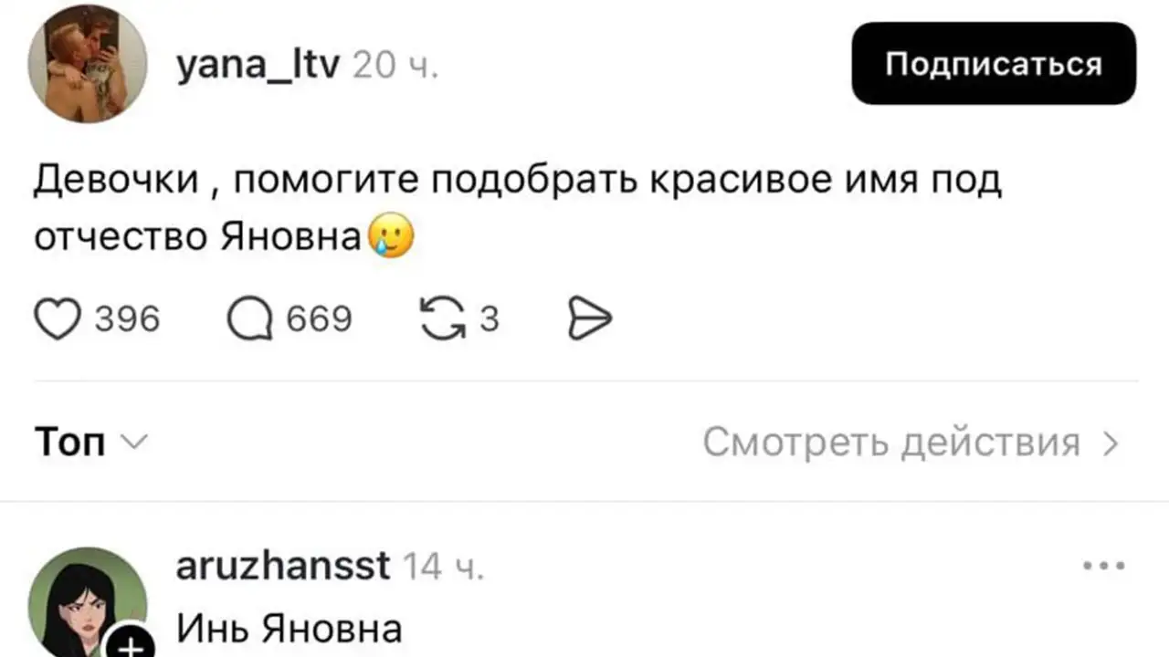 Что бы вы ответили на пост «Помогите подобрать имя для Яновны»? Одна девушка задала этот вопрос в социальной сети Threads* и получила такие варианты, которые никак не ожидала получить.