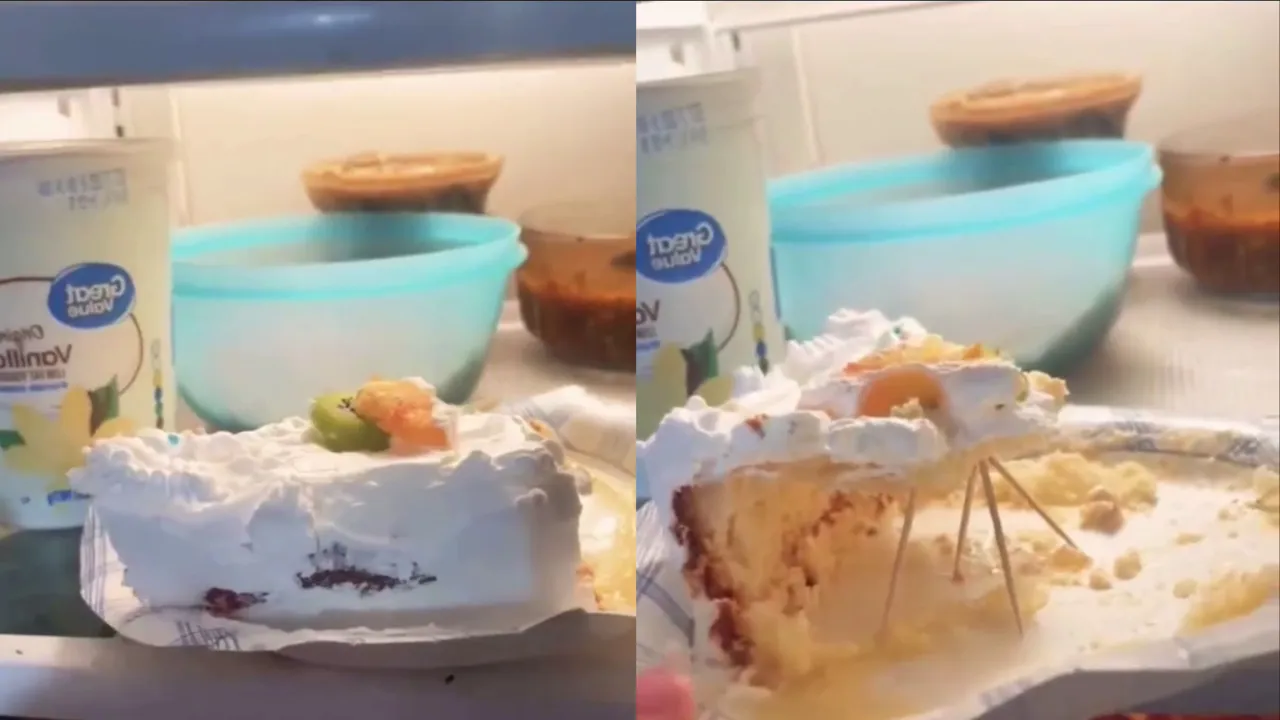 Этот ролик начинается с простого открытия холодильника, но быстро превращается в комедийный шок. Мужчина показывает кусок торта, который выглядит вполне невинно, пока он не разворачивает тарелку. Оказывается, от торта осталась лишь основа, поддерживаемая зубочистками.