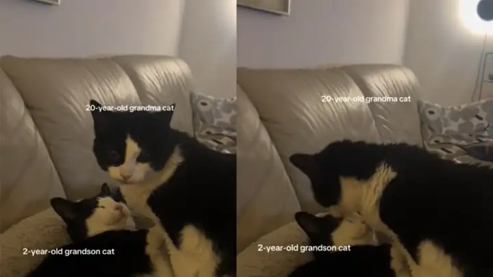 Сеть покорило видео с 20-летней кошкой, ухаживающей 2-летним внуком